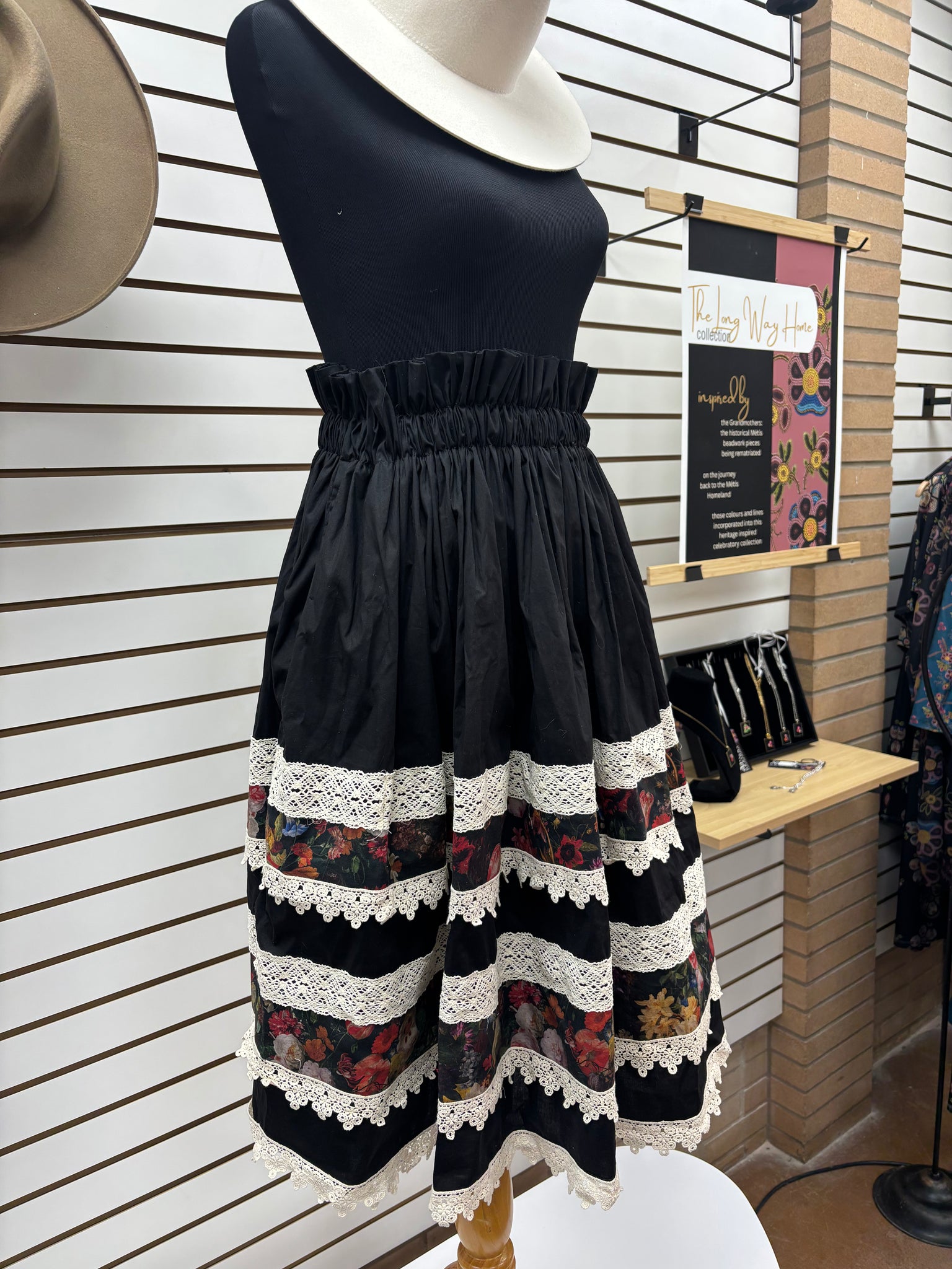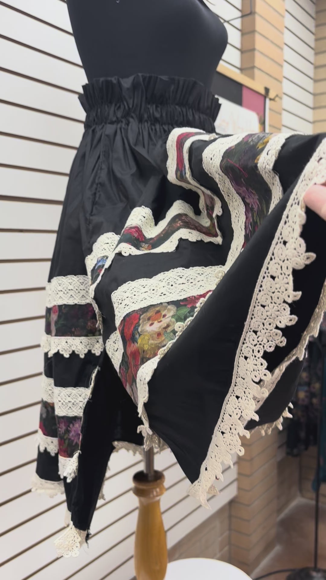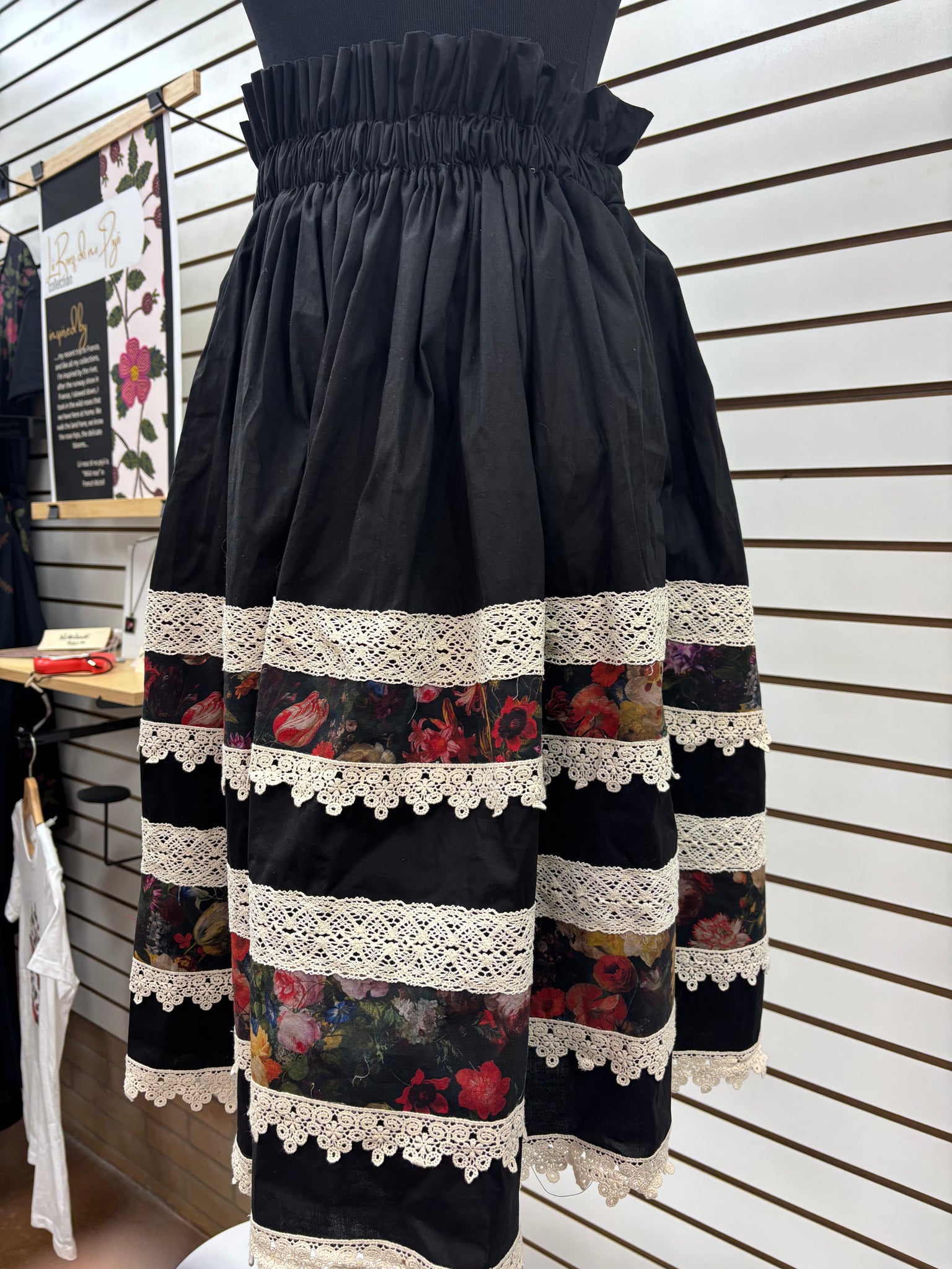This piece is made out of black Cotton Sateen (98% cotton, 2% lyrca). The trim is 100% cotton. It has a slight sheen to it, cotton is breathable and beautiful to wear. Rows of cotton lace and cotton floral fabric make this the most beautifully detailed skirt. It has lovely feel due to the rows of lace! The paper bag waist makes it easy to wear. Pockets .